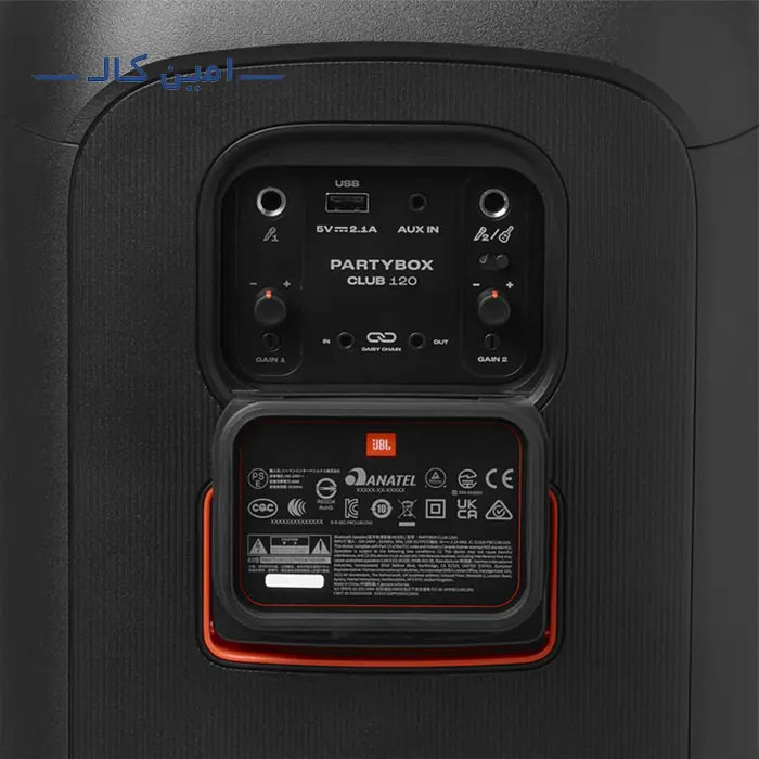 • اتصالات سیمی: علاوه بر اتصالات بی‌سیم، اسپیکر JBL PartyBox Club 120 با داشتن ورودی‌ها و خروجی‌های متنوع سیمی، انعطاف‌پذیری بیشتری را در اتصالات ارائه میدهد. این اسپیکر دارای ورودی میکروفون و گیتار، همچنین یک پورت AUX برای اتصال دستگاه‌هایی با خروجی صدای استاندارد است. پورت USB نوع A نیز به عنوان یک پاور بانک عمل کرده و امکان شارژ دستگاه‌های دیگر را فراهم می‌آورد.